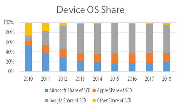 In a way, these changes are being inevitably drawn out by the diversity in the current device landscape. The chart below illustrates the current and projected worldwide market share by operating system across all smart connected devices (SCD), which is the combination of smartphones, tablets and PCs. Google holds the largest share, but both Apple and Microsoft are expected to still hold a large enough percentage in the future to lead to a stalemate.