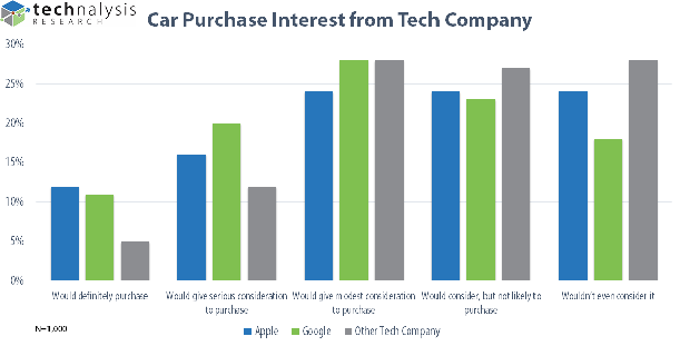 TECHnalysis Research recently surveyed 1,000 U.S. consumers who both own a car and are planning to purchase a new one within the next two years. They were asked a wide range of questions regarding car brands, features, technologies, and much more. One of the questions specifically focused on the potential interest that consumers would have in purchasing a car sold by Apple, Google, or another major tech company.