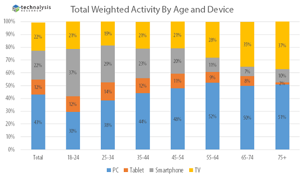 One of the many potentially surprising data points from the study is that consumers, on average, use their PCs for a larger percentage of their total device time than smartphones, TVs or tablets. Overall PC usage is 43%, versus 22% for both smartphones and TVs and 12% for tablets. Averages don’t tell the full story, however, because there are dramatic differences by age, with younger people using their smartphones more than any device and older people using their PCs significantly more. In fact, smartphone usage among 18-24 year-olds is more than 5x higher than 65-74 year olds, but PC usage is 67% higher in the older group than in the younger. While those numbers may not be surprising, the linearity of the transition across age groups certainly is.