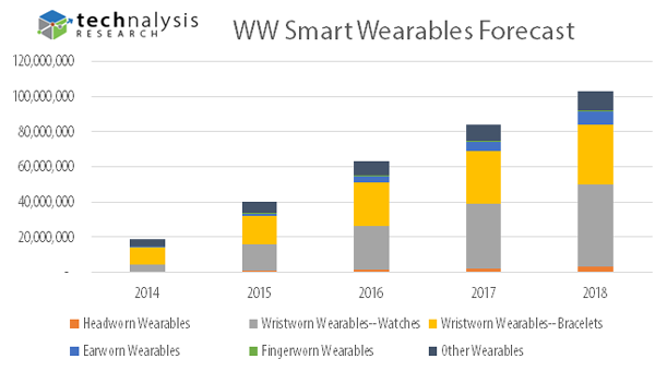 ©2014, TECHnalysis Research The newly released wearables forecast report from TECHnalysis Research shows that the vast majority of wearable units and revenues (roughly 75% and 80% respectively) will be derived from the two wrist-worn wearable categories: smart watches and smart bracelets. The report breaks up the market into six separate sub-categories, including head-worn wearables, ear-worn wearables, finger-worn wearables, the two wrist-worn categories (smart watches and smart bracelets) and the “other” wearables category, which incorporates devices such as small activity trackers carried in pockets, as well as others that don’t neatly fit into the defined categories. The report includes unit shipments and revenues for each of the six categories for both the worldwide and US markets. In addition, given the very dynamic nature of the wearables market, the report includes three different forecast scenarios: